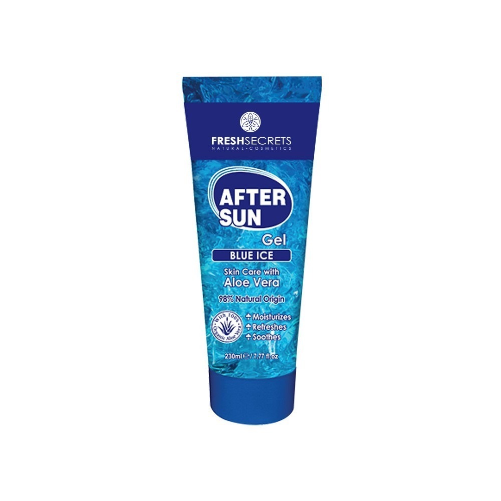 Fresh Secrets After Sun Gel Blue Ice. After sun Koelgel. De formulering, die is verrijkt met aloë, olijfolie en panthenol, hydrateert en voedt de vermoeide huid door de zon, en helpt om peeling te voorkomen. Het biedt onmiddellijk gevoel van frisheid.
